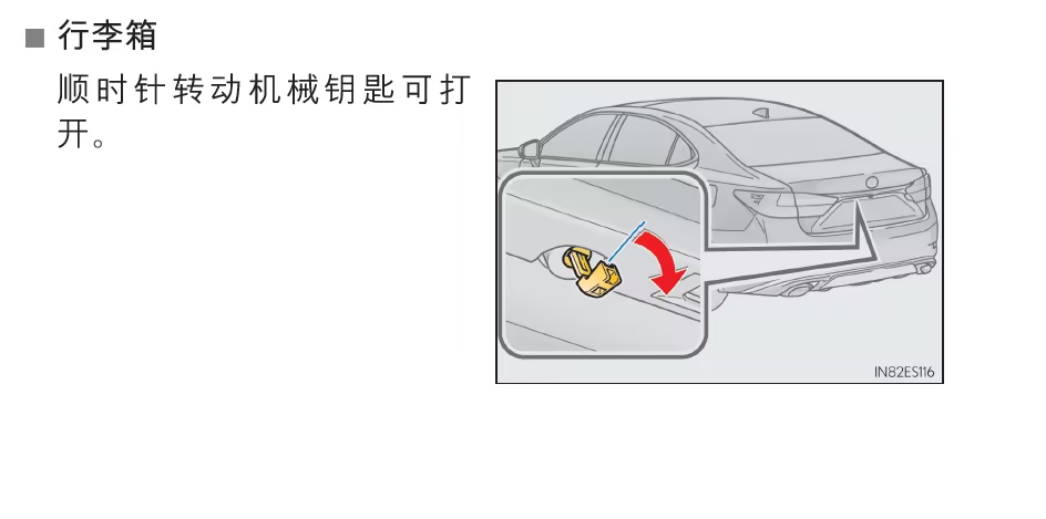 雷克萨斯 ES 2017款 300H Mark Levinson雷克萨斯ES 2017款的应急解P档功能位于车辆前排的杯架内。 1. 找到应急解锁工具:在车辆的后备箱里,有一个红色的小应急解锁工具。​2. 插入杯架:将工具插入前排杯架的一个预留孔中。​3. 下压解锁:垂直向下用力按压工具,即可解除P档锁止。后备箱搭电没电打不开后备箱时,使用遥控器中的机械钥匙打开后备箱,牌照上方有机械钥匙孔。如图∶搭电∶